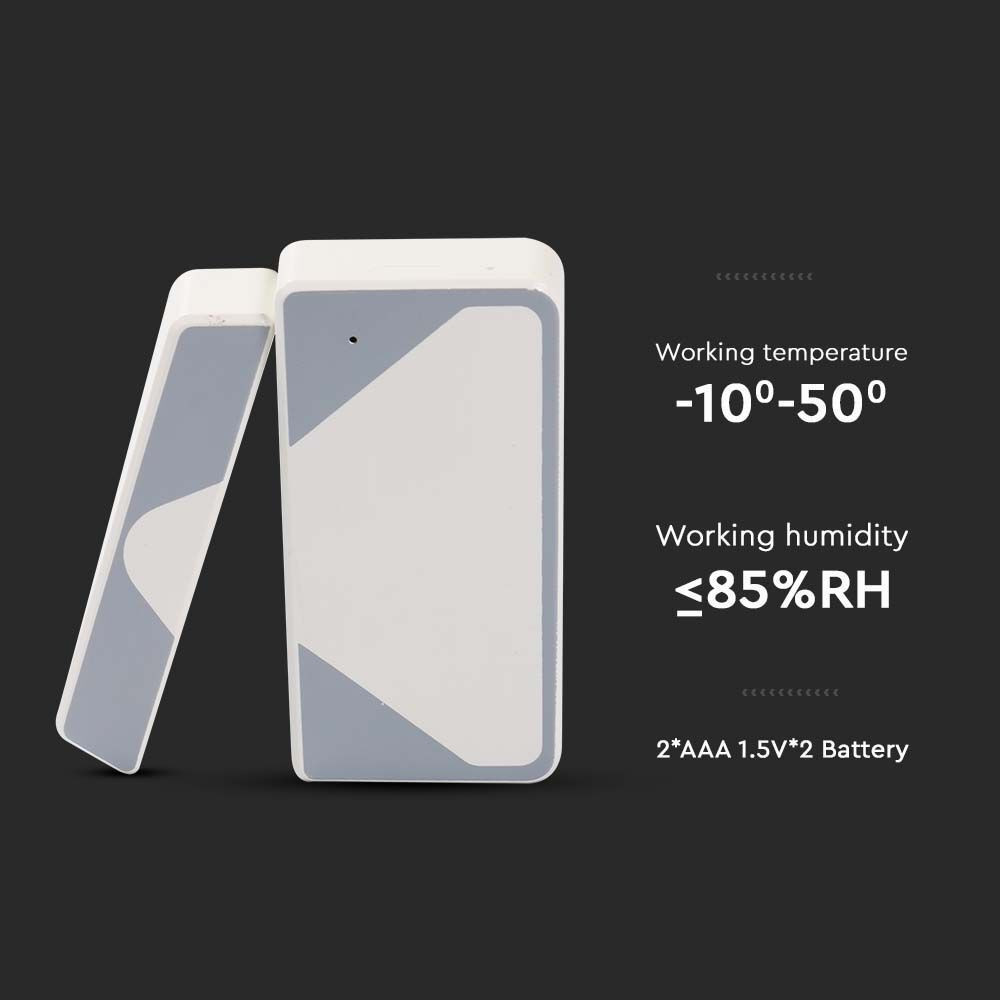 Bemutatkozik a VT-5177 WiFi ajtóérzékelő, egy innovatív megoldás a fokozott biztonság és megfigyelés érdekében. Ez az infravörös mozgásérzékelő megbízható WiFi csatlakozással rendelkezik, és valós idejű riasztásokat küld okoseszközein keresztül. A letisztult fehér színű eszköz tartós ABS anyagból készült, így hosszú élettartamot biztosít. Kompakt méretének köszönhetően, 72,5 mm hosszú, 50 mm széles és 16,5 mm magas, zökkenőmentesen illeszkedik bármilyen ajtónyílásba akadálytalanul. A VT-5177 IP20 besorolású, így beltéri használatra is alkalmas. -10°C és +50°C közötti üzemi hőmérséklet-tartományával sokoldalúan használható különféle környezetekben. Az érzékelő figyelemre méltó érzékelési tartománnyal és sebességgel érzékeli a mozgást, biztosítva, hogy riasztást kapjon, amikor mozgást érzékel. A telepítés egyszerű, lehetővé téve az azonnali használatot, míg az eszköz 2 db AAA elemmel (egyenként 1,5 V) működik, így kényelmes akkumulátor-üzemidőt biztosít. Az otthoni biztonsághoz vagy a belépési pontok megfigyeléséhez ideális VT-5177 kötelező darab azok számára, akik a nyugalomra vágynak.