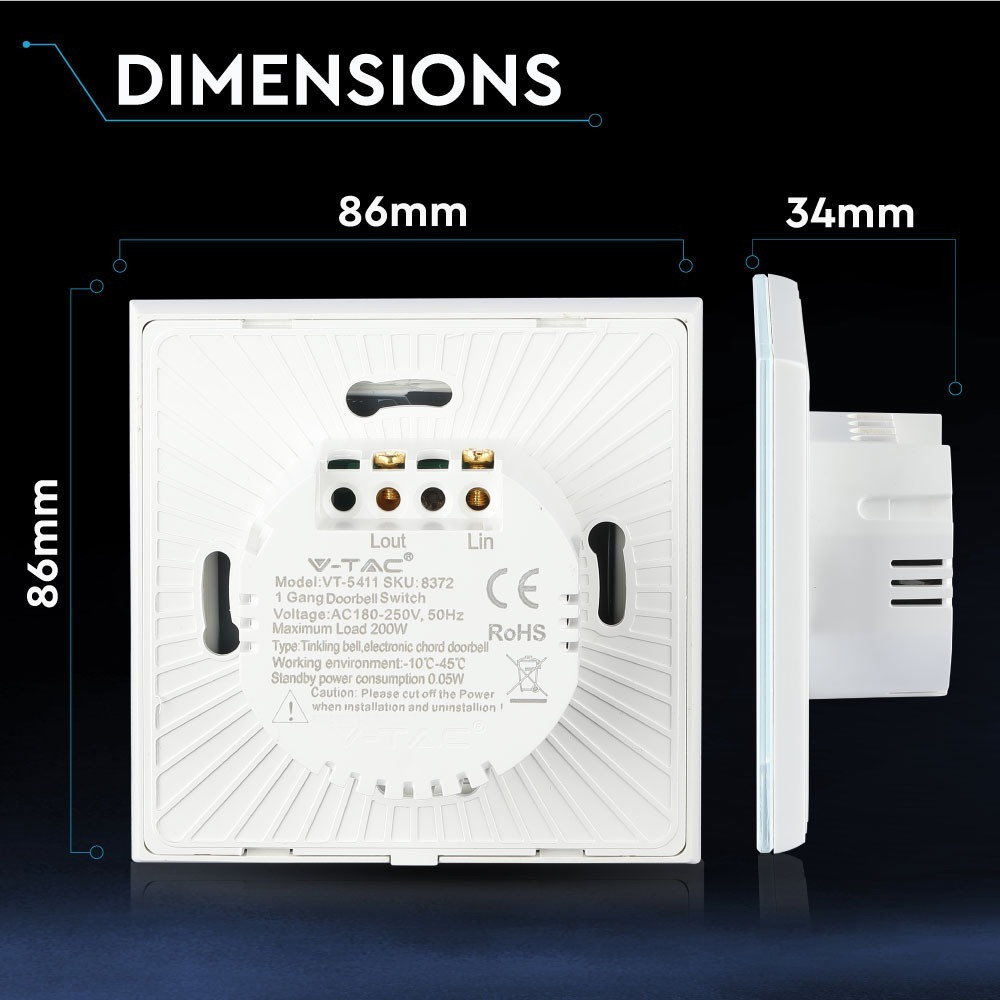 Bemutatjuk a VT-5411 egycsatornás, egyirányú kapucsengő kapcsolót letisztult fehér színben, amelyet a funkcionalitás és a stílus egyaránt szem előtt tart. Ez a fejlett kapucsengő kapcsoló tökéletes a modern otthonokba, felhasználóbarát felülettel és tartós konstrukcióval. Kiváló minőségű PC és üveg bevonatból készült, kompakt kialakítású, 86 mm széles és magas, valamint 34 mm hosszú méretekkel. AC 180-250V, 50/60Hz bemeneti teljesítménytartománnyal méterenként 5-500 watt maximális terhelést támogat, így megbízható teljesítményt biztosít. Az IP20 besorolás alkalmassá teszi beltéri használatra. A termék energiatakarékos, és 2 év garanciával rendelkezik, ami tükrözi a magas minőségi szabványokat. Az egyszerű telepítéshez ideális VT-5411 zökkenőmentesen integrálható otthonába, kényelmes megoldást kínálva a könnyű ajtóhozzáféréshez. Hatékony kialakítása hosszú élettartamot garantál, a csomag pedig dobozonként 100 darabot tartalmaz, így tökéletes nagy tételben történő vásárláshoz. Frissítse bejáratát a VT-5411 kapucsengő kapcsolóval, és élvezze a modern kényelmet.