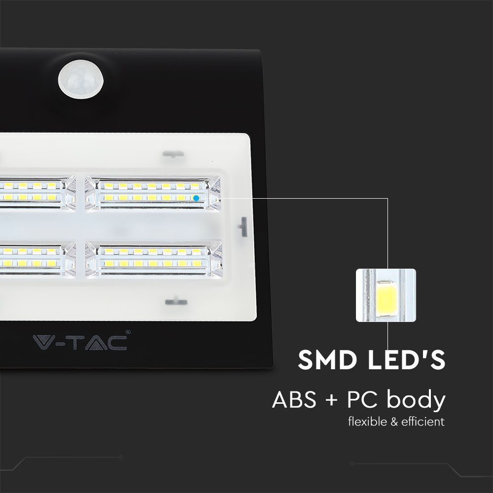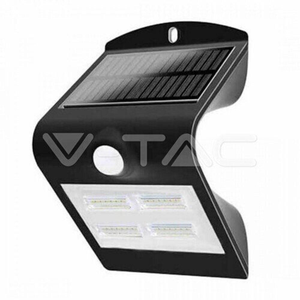 Szolár LED fali lámpa mozgásérzékelővel, 3w, 4000K, természetes fehér, 400lm, 60°, fekete, CRI>80, IP65, V-TAC, 7528