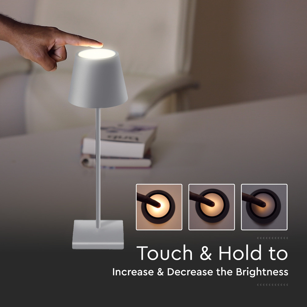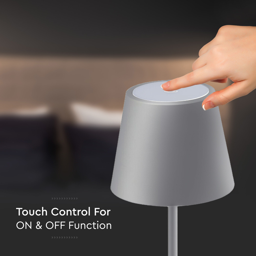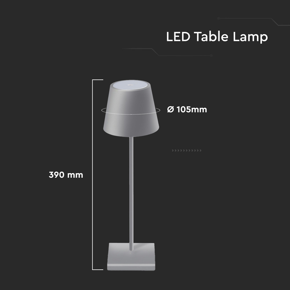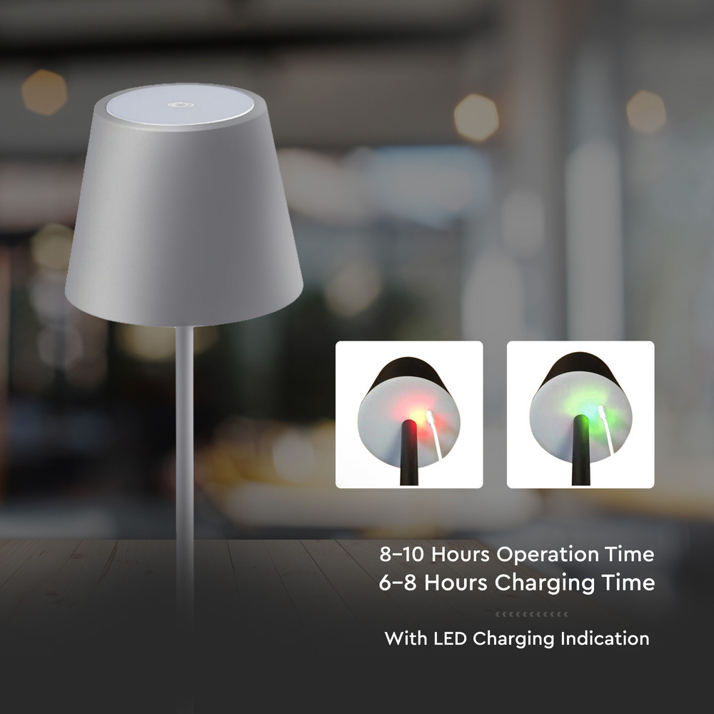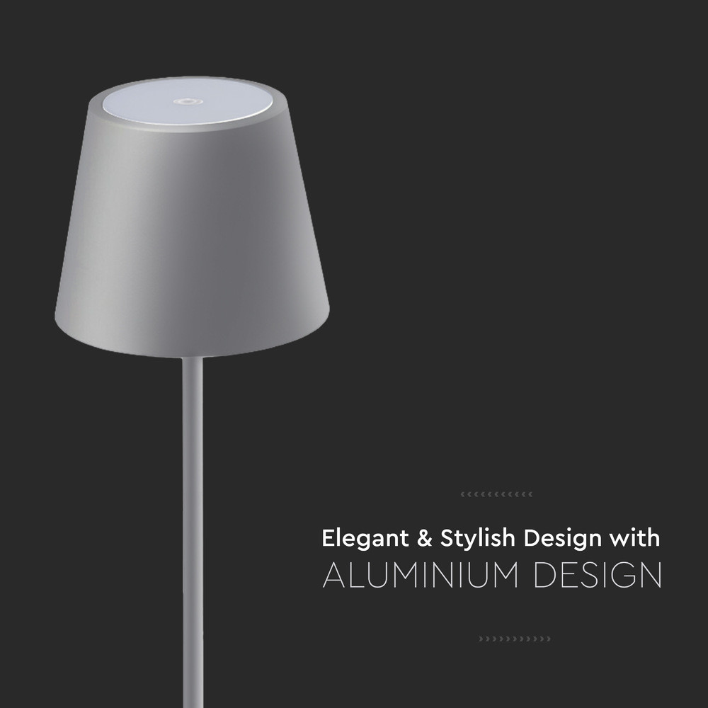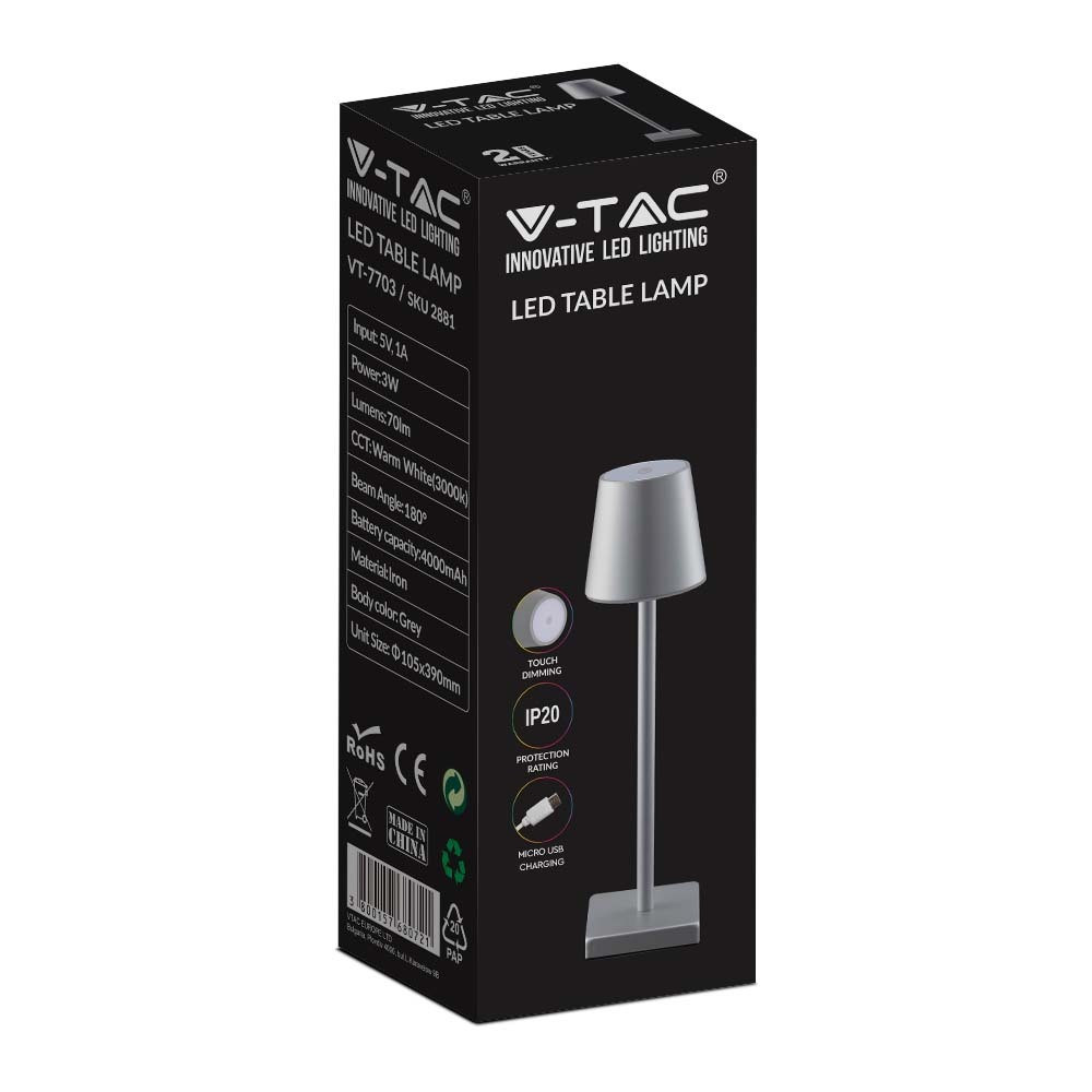 Újratölthető asztali lámpa, 3w, 3000K, meleg fehér, 70lm, 180°, szürke, dimmelhető, V-TAC, 2881