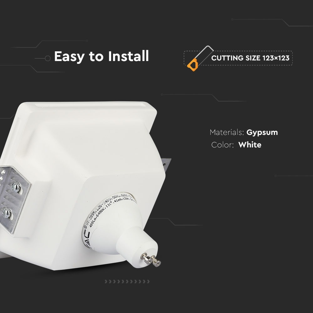 VT-801 GU10 gipsz lámpatest matt üveggel egy elegáns és modern süllyesztett világítási megoldás, amely tökéletes beltéri terek díszítésére. A négyzet alakú és tartós gipszből készült lámpatest ötvözi a funkcionalitást az esztétikai megjelenéssel. A fényeloszlás optimális szögének köszönhetően hatékony megvilágítást biztosít nagy fényerővel. A matt üveg bevonat eleganciát kölcsönöz, miközben finoman szórja a fényt. A könnyű, 0,778 kg-os súlyú és 120x120x60 mm-es méretű lámpatest könnyen telepíthető és zökkenőmentesen működik IP20 besorolású környezetben. Maximum 35 watt terhelést támogat, és GU10-es foglalatokkal kompatibilis. Az egység kényelmes, 24 darabos kiszerelésben kapható, és okos választás az energiatakarékos világításhoz, mivel hosszú élettartamot és alacsony karbantartási igényt biztosít. Akár lakó-, akár kereskedelmi helyiséget világít meg, a VT-801 biztosítja a környezet megfelelő megvilágítását, miközben hozzájárul az energiatakarékos életmódhoz. Különböző alkalmazásokhoz ideális, zökkenőmentesen integrálódik a dizájnba, miközben villódzásmentes, kényelmes fényélményt nyújt.