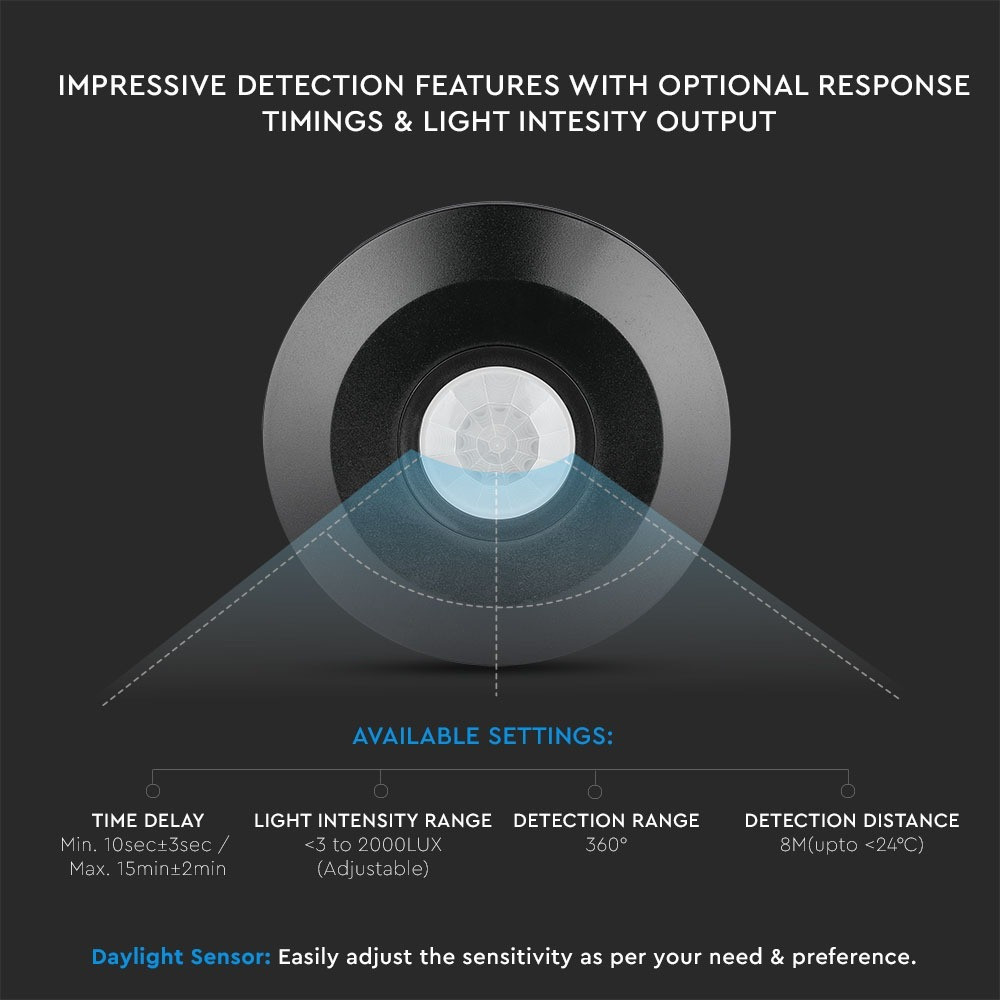 Bemutatkozik a VT-8027 PIR mennyezeti érzékelő elegáns fekete színben, amelyet úgy terveztek, hogy zökkenőmentesen integrálható legyen bármilyen környezetbe. Ez az infravörös érzékelő maximum 1000 W-os LED terhelhetőségű, így ideális a hatékony világítási megoldásokhoz. 360 fokos érzékelési szögével és 24°C alatti hőmérsékleten 8 méteres maximális érzékelési távolságával megbízható mozgásérzékelést biztosít még 0,6 és 1,5 m/s közötti változó sebességek esetén is. Tartós PC anyagból készült, ez a lapos mennyezeti érzékelő kompakt méretekkel rendelkezik (120 mm hosszú, 35 mm széles, 124 mm magas), és tökéletes felületi telepítésekhez. 220-240 V-os, 50/60 Hz-es váltakozó áramú bemeneti tápellátásról működik, és IP20-as védelemmel rendelkezik, így beltéri környezetben is használható. Az állítható környezeti fényérzékenység (3-2000 LUX) lehetővé teszi a fényviszonyokhoz igazított testreszabott teljesítményt. Az energiatakarékos technológiának és a hosszú élettartamnak köszönhetően a VT-8027 tökéletes minden olyan helyiségbe, ahol a hatékonyság és a modern dizájn a legfontosabb. Nagy tételben kapható, dobozonként 50, raklaponként pedig 1500 egységet tartalmazó termék, így kiváló választás nagyobb projektekhez. Tapasztalja meg a fejlett mozgásérzékelést a VT-8027 optimális világításvezérlésével.