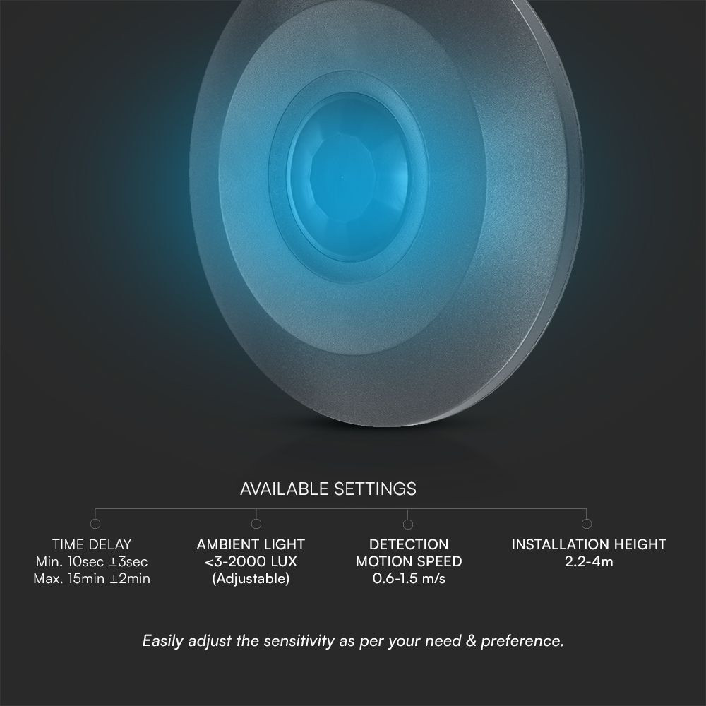 Bemutatkozik a VT-8027 PIR mennyezeti érzékelő, elegáns, teljesen fekete kivitelben. Ez az innovatív mozgásérzékelő energiahatékonyságra van optimalizálva, és maximum 1000 W-os LED-terheléseket támogat. Fejlett infravörös technológiával készült, 360°-os érzékelési tartományt kínál, és akár 7 méter távolságból is képes érzékelni a mozgást, így ideális különféle beltéri környezetekbe. A PC-ből készült, masszív házzal rendelkező érzékelő IP20-as besorolású, ami tartósságot és hosszú élettartamot biztosít. -25 és +50°C közötti hőmérsékleti tartományban működik, és <3 és 2000 LUX között állítható környezeti fényérzékenységgel rendelkezik. A telepítés egyszerű a felületre szerelhető típusnak köszönhetően, így sokféle alkalmazáshoz alkalmas. Az érzékelő késleltetési funkcióval rendelkezik, amely minimum 10 másodperctől maximum 15 percig terjed, így az egyedi igényeket is kielégíti. Ezenkívül 5 év garanciával is nyugalmat biztosít. Dobozonként 50, raklaponként pedig 1750 darabos kiszerelésben csomagolva a VT-8027 a teljesítmény, a megbízhatóság és a stílus tökéletes kombinációját jelenti a modern világítási megoldások terén.