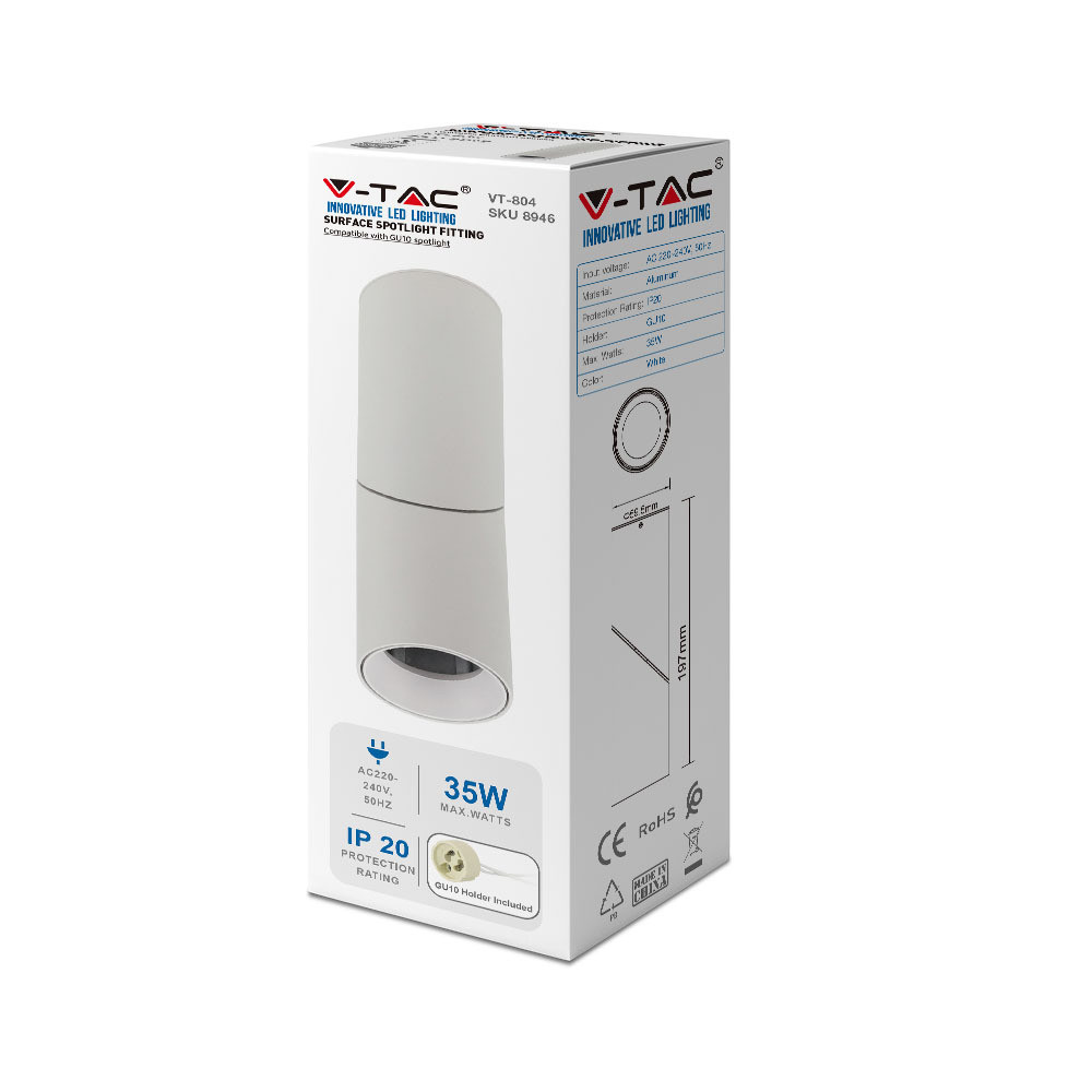 Világítsa meg otthonát a VT-804 felületre szerelhető GU10-es foglalattal. Prémium alumíniumból készült, ez a stílusos, kerek lámpatest 197 mm magas és 59,5 mm széles, így tökéletes kiegészítője bármilyen modern dekorációnak. Az optimális fényeloszlásra tervezett sugárzási szögnek köszönhetően világos és barátságos légkört teremt. Ez a lámpatest hatékonyan működik AC 220-240V AC, 50Hz frekvencián, maximum 35 watt terheléssel. A letisztult fehér kivitel zökkenőmentesen illeszkedik bármilyen belső térbe, eleganciát kölcsönözve a funkcionalitás feláldozása nélkül. IP20 besorolással beltéri használatra alkalmas, míg a tartós kialakítás hosszú élettartamot biztosít 3 év garanciával. Sokoldalú és felhasználóbarát, a VT-804 ideális lakossági és kereskedelmi alkalmazásokhoz egyaránt. A 20 darabos kiszerelés és a könnyű szállítást biztosító teljes kartonmennyiség révén ez a lámpatest nagyszerű választás minden méretű projekthez. Tapasztalja meg a kiváló minőségű világítást a VT-804-gyel, és alakítsa át környezetét.