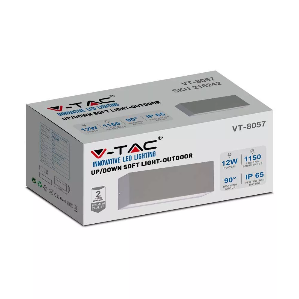 LED fali lámpa kétirányú, 12w, 6400K, hideg fehér, 1155lm, 90°, szürke, CRI>80, IP65, V-TAC, 218244