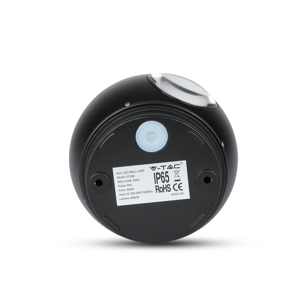 LED fali lámpa kétirányú kerek IP65, 6w, 3000K, meleg fehér, 660lm, 90°, fekete, CRI>80, V-TAC, 8303