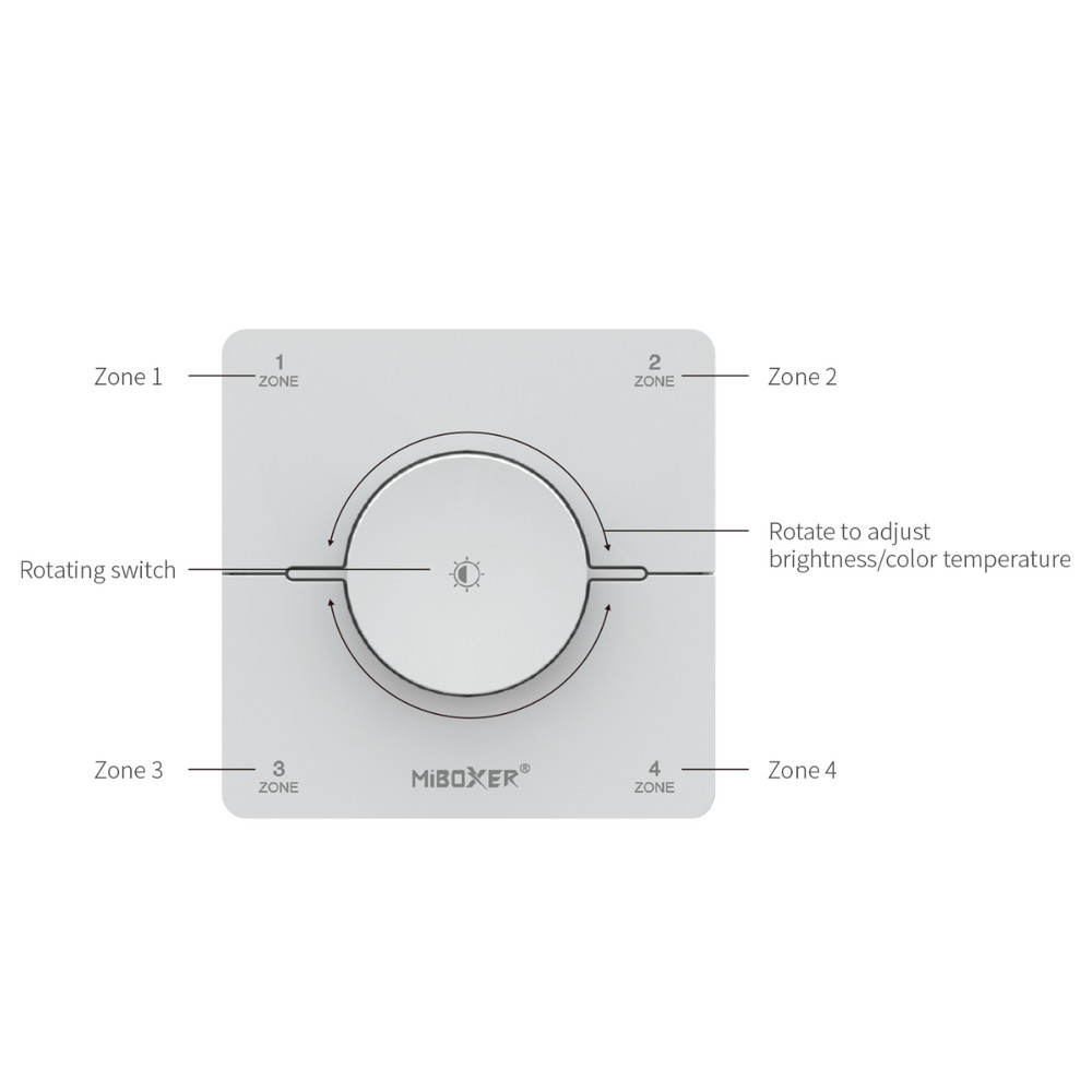 Vezeték nélküli, fali, érintős vezérlő - fényerő szabályozás és fehér színhőmérséklet vezérlés - MiBoxer K0S 4-zónás CCT tekerő paneles távirányító