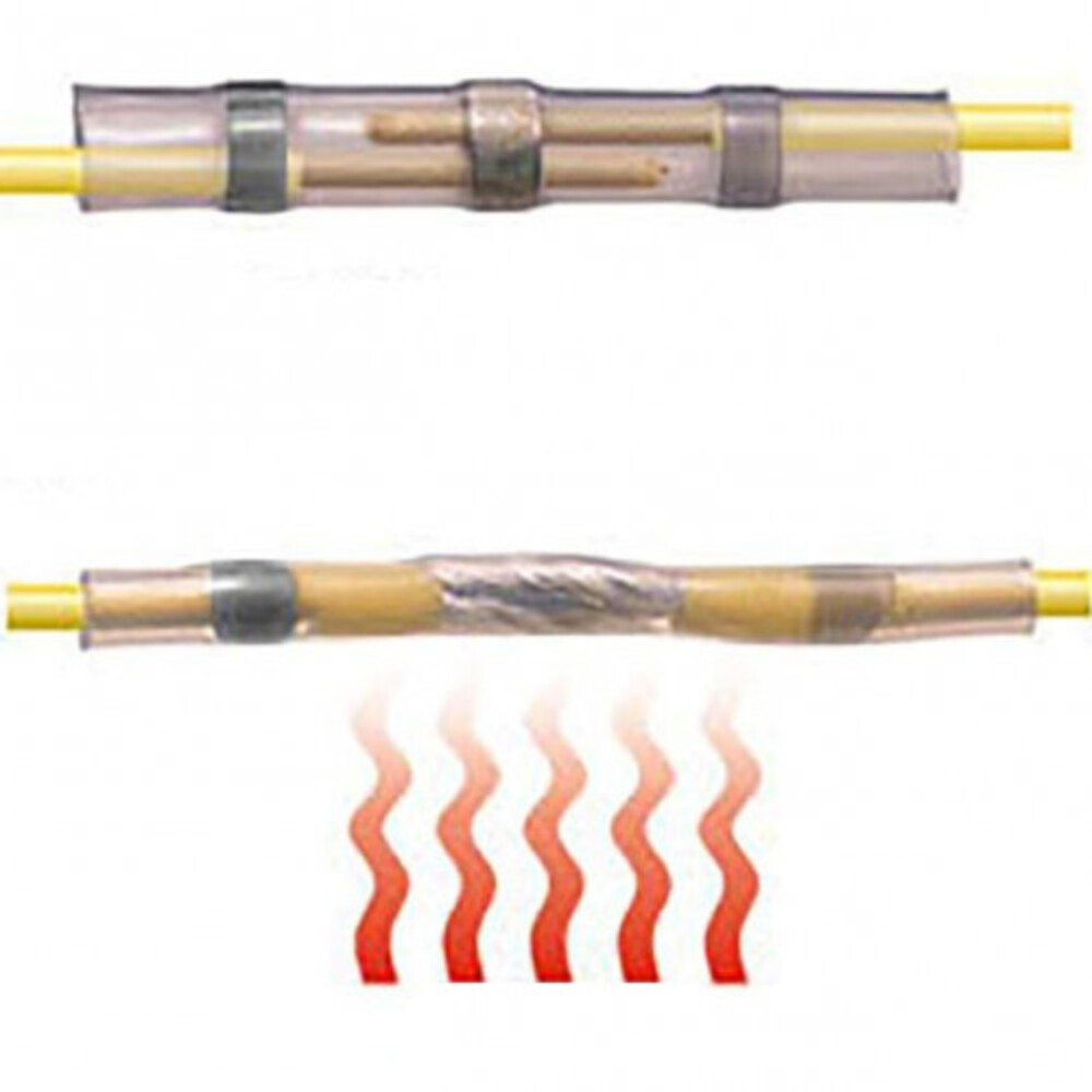 Vezeték összekötő zsugorcső a közepén óngyűrűvel, amely tökéletes eszköze a forrasztás elkerülésének. Hevítés során az ón megolvad, így összekötve a két vezetéket.