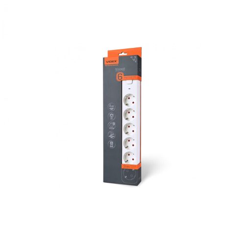 Videx Oncord fehér színű 6-os professzionális hosszabbító kapcsolóval 3m-es kábellel