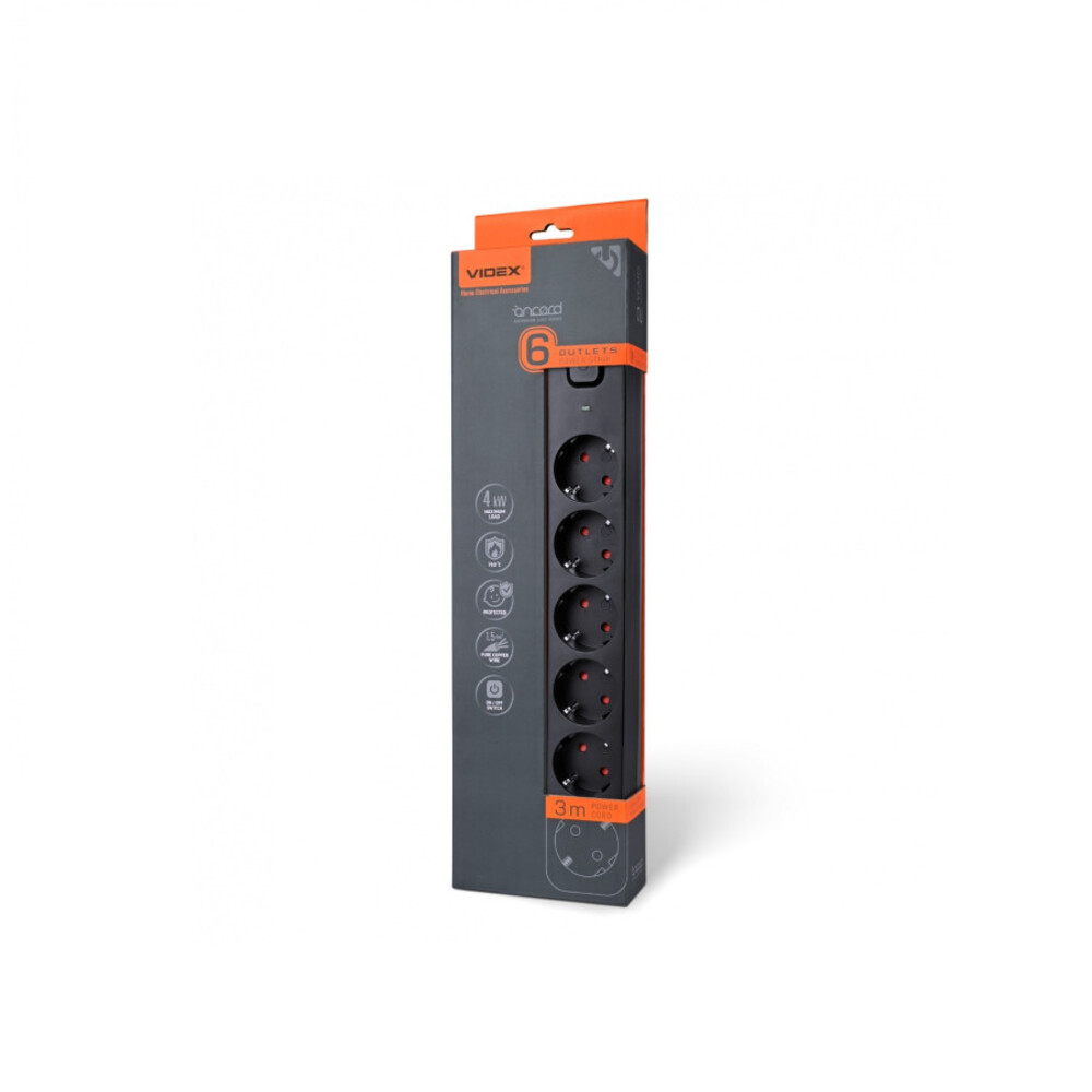 Videx Oncord fekete színű 6-os professzionális hosszabbító kapcsolóval 3m-es kábellel