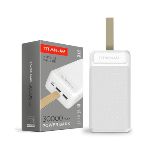 Videx TITANUM power bank fehér színű 30000mAh TPB-914, Bemeneti feszültség:MicroUSB: DC5V/2A; C típus: 5V/2A Kapacitás:30000mAh Csatlakozó típusa:Micro USB, C típusú, 2USB Kimeneti feszültség:USB1 és USB2: DC5V/2.1A (max.) Mennyiség a dobozban:28db Szín:Fehér Anyagok:ABS Súly:583g Teljes méretek:140mm x, ledmasterb2b