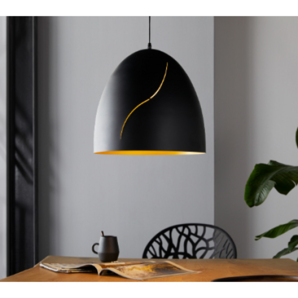 A HUNNINGHAM mennyezeti függesztett LED lámpa fekete búrával és arany színű belső felülettel.