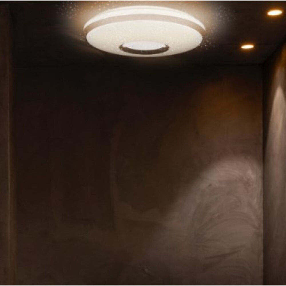 A Strühm Opera modern mennyezeti led panel, amely csillogó hatással világít a búráján átszűrődő fénysugár pontoknak köszönhetően.