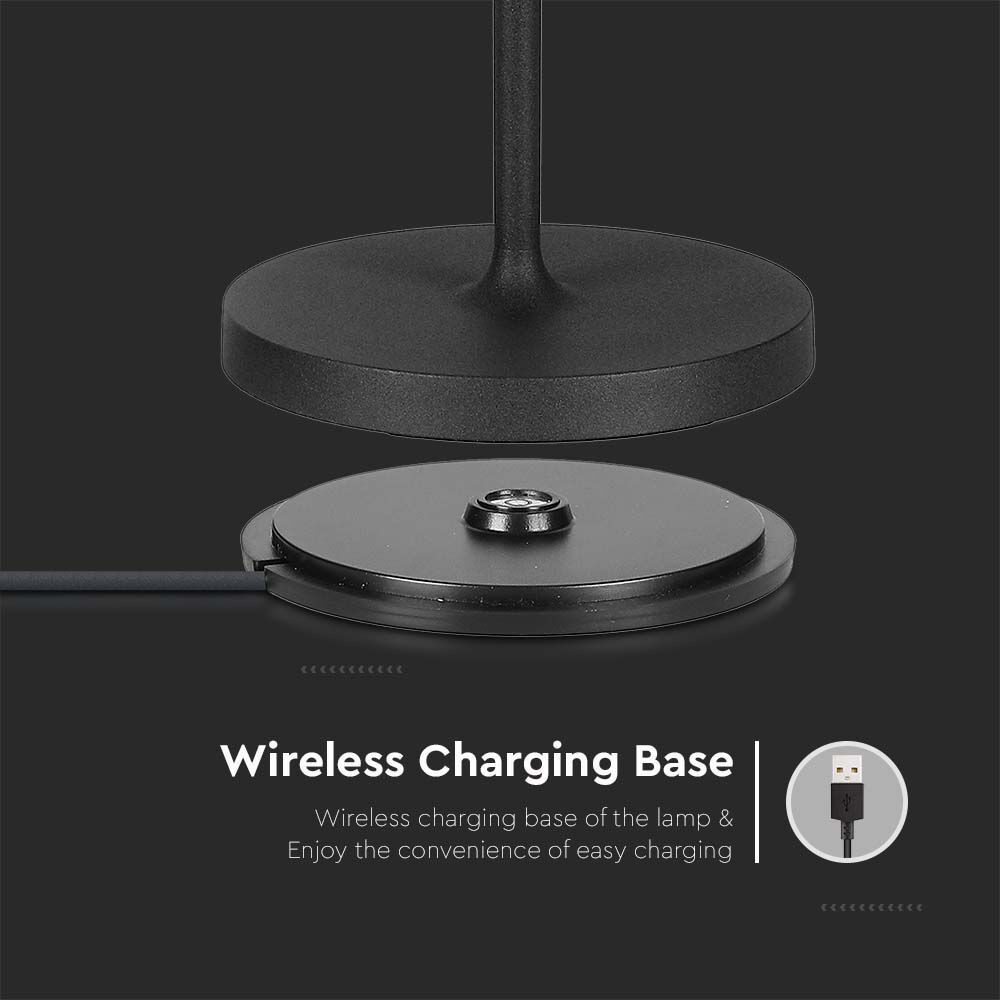 Újratölthető asztali lámpa, 2w, 3000K, meleg fehér, 200lm, 180°, fekete, dimmelhető, IP54, V-TAC, 7652
