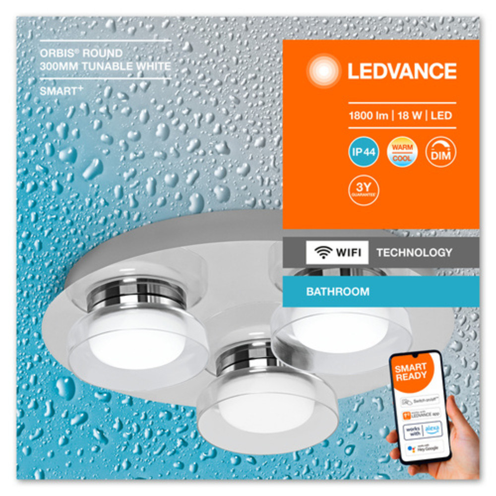 Okos fürdőszoba dekorációs plafon és fal wifi technológiával, IP44 TW és dimmelhető világítótestekkel. Termékjellemzők: Védelmi típus: IP44. Vezérelhető a LEDVANCE SMART+ WiFi App alkalmazáson keresztül (minimum Android™️ 4.4 vagy iOS 10.0 szükséges). Hangvezérléssel is vezérelhető: Google Assistant vagy Amazon Alexa. Szabályozható színhőmérséklet a Tunable White segítségével: 3.000…6.500 K. Dimmelhető. Hálózati protokoll: WiFi. Termék előnyei: egyszerű és gyors telepítés. Alkalmazási területek: Fürdőszobák. Felszerelés / tartozékok: Rögzítő konzol tartozik hozzá. Rögzítő csavarok és dübelek tartoznak hozzá. Az alkalmazás vagy hangvezérlés használata kompatibilis okosotthon rendszerrel lehetséges. A vezérléshez a LEDVANCE SMART+ WiFi alkalmazáson keresztül egy okostelefon vagy táblagép szükséges.