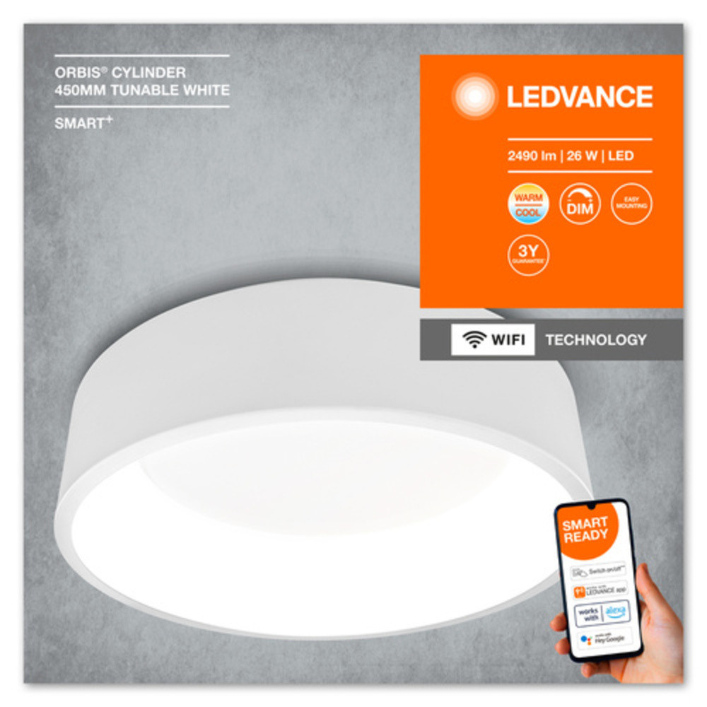 Dekoratív mennyezeti lámpatestek WiFi technológiával. Termékjellemzők: Vezérelhető a LEDVANCE SMART+ WiFi alkalmazáson keresztül (minimum Android™️ 4.4 vagy iOS 10.0 szükséges). Vezérelhető hangutasítással: Google Assistant vagy Amazon Alexa. Szabályozható színhőmérséklet a Tunable White segítségével: 3,000...6,500 K. Dimmelhető. Hálózati protokoll: WiFi. Termék előnyei: Könnyű és gyors telepítés. Felhasználási területek: Beltéri alkalmazások. Konyhák, nappalik, gyerekszobák vagy otthoni irodák. Felszerelés / Tartozékok: Tartószerelvény tartozék. A csavarok és tiplik is tartozék. Az alkalmazás vagy hangutasítás vezérléshez kompatibilis okosotthon rendszer szükséges. A LEDVANCE SMART + WiFi App vezérléséhez egy okostelefon vagy tablet szükséges.
