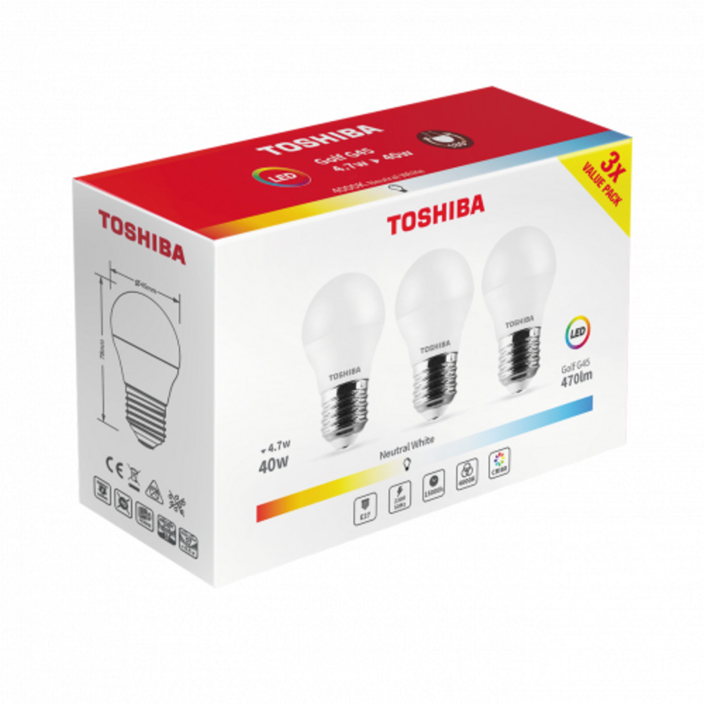 LED lámpa , égő , kisgömb , E27 foglalat , 4.7 Watt , 180° , természetes fehér , 3 darabos csomag , TOSHIBA , 5 év garancia