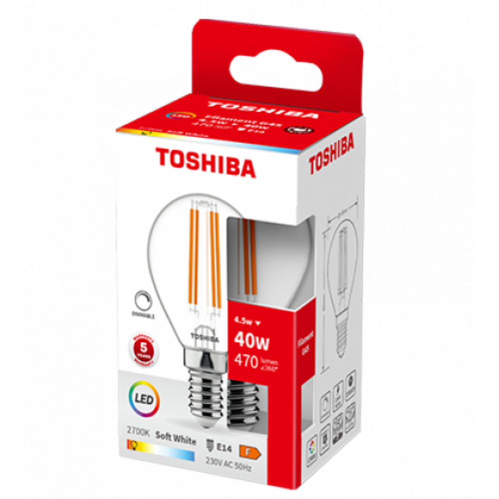 LED lámpa , égő , izzószálás hatás , filament , E14 foglalat , 4.5 Watt , dimmelhető , meleg fehér , TOSHIBA , 5 év garancia
