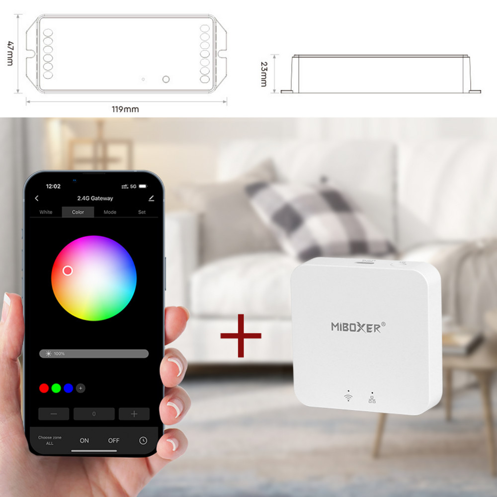 2 az 1-ben Miboxer (Mi-Light) csoport (zóna) vezérlő (2,4 GHz) monokróm illetve CCT (állítható fehér színhőmérsékletű LED szalagokhoz  DC12-48V
