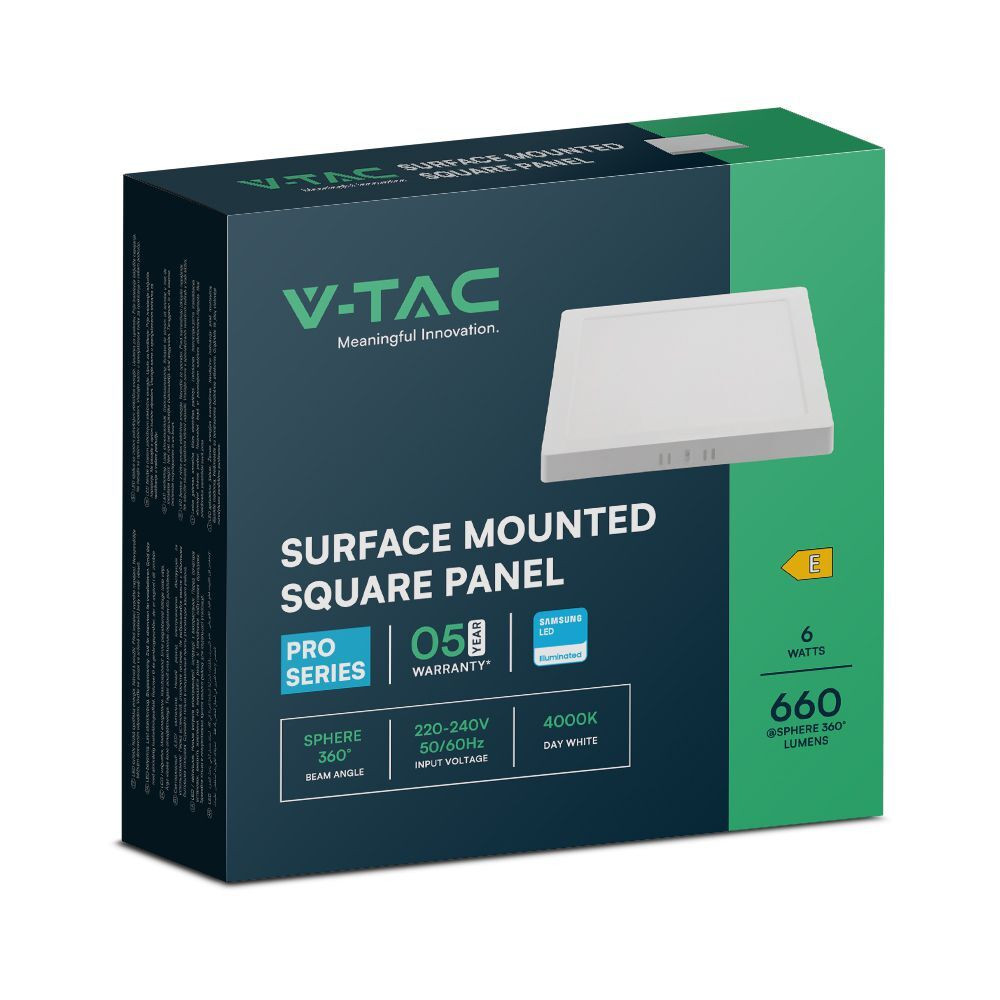 VT-60006 egy kiváló minőségű, 6 W-os, háttérvilágítású, felületre szerelhető panel Samsung chippel, amely tökéletes a tér megvilágítására fényes, 4000K-es nappali fehér fénnyel. A letisztult, négyzet alakú, energiatakarékos LED panel 660 lumen hasznos fényerőt biztosít, miközben mindössze 6 W energiát fogyaszt, így 85%-os hatásfokával kiváló választás az energiamegtakarításhoz. Tartós műanyagból készült, a panel könnyű, mégis masszív, akár 20 000 órás élettartammal. Hatékonyan működik AC 220-240V bemeneti feszültségen 50/60Hz-en, így különféle környezetekbe is alkalmas. IP20-as besorolásának köszönhetően ideális beltéri használatra, és széles üzemi hőmérsékleti tartományt képes kezelni -20 és +45°C között. A telepítés egyszerű, felületre szerelhető, a kompakt, 120,8 mm x 120,8 mm x 30,7 mm-es méretek pedig biztosítják, hogy zökkenőmentesen illeszkedjen bármilyen dekorációba. A panel nem szabályozható fényerővel, és megbízható elektromos teljesítményt nyújtó meghajtótípussal rendelkezik. Villódzásmentes működésével és 5 év garanciájával a VT-60006 panel a hosszú élettartamot és a megbízhatóságot ötvözi, így tökéletes kiegészítője mind a lakossági, mind az kereskedelmi környezetnek. Minden doboz 80 egységet tartalmaz, és a több mint 80-as színvisszaadási indexnek (CRI) köszönhetően terei élénknek és élethűnek fognak tűnni.