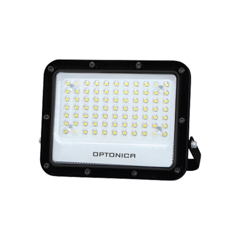Optonica LED SMD reflektor fekete házzal, IP65 védelemmel. Nagyteljesítményű LUMILEDS SMD LED-eket alkalmazó reflektor, amely 50 W fogyasztás mellett kb. 5000 lm fényáramot biztosít 6000 K színhőmérsékleten (hideg fehér). Robusztus, alumínium hűtőbordás háza és IP65-ös védettsége révén por- és vízálló kivitel, így különösen alkalmas kültéri és ipari világításra, például homlokzatok, parkolók, munkaterületek és biztonsági megvilágítás megvalósítására. Az állítható tartószerkezet könnyű szerelhetőséget és célirányos megvilágítást tesz lehetővé, azonnali bekapcsolást és alacsony karbantartási igényt kínál. Energiatakarékos megoldás hagyományos halogén vagy nátrium lámpák helyett, kedvező fényhatékonysággal és hosszú üzemidőre tervezve.