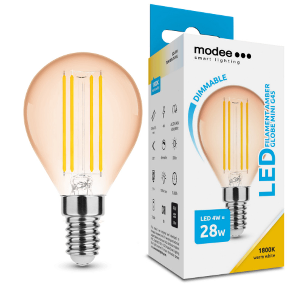 LED lámpa , égő , izzószálas hatás , filament , E14 foglalat , G45 , 4 Watt , dimmelhető , meleg fehér , 1800K , borostyán sárga , Modee